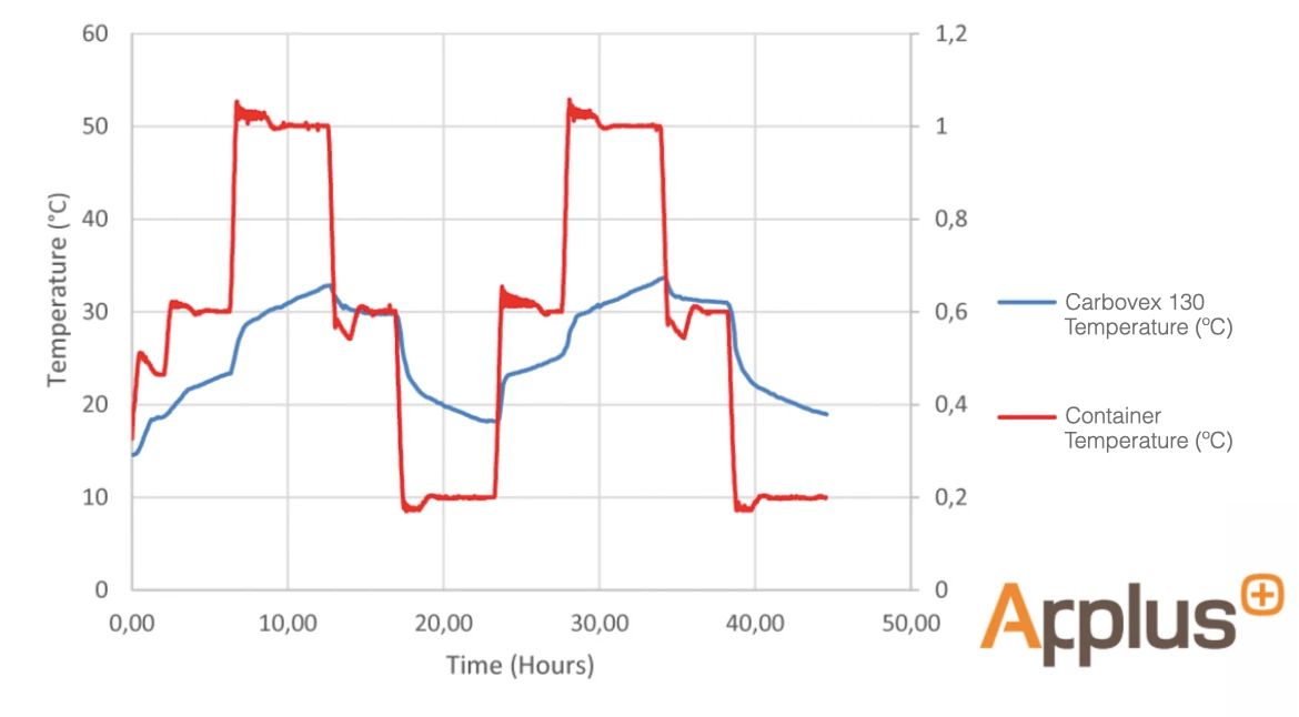 Extreme conditions were simulated to observe the basic behavior of the Thermal liner. The material was exposed to the following temperature sequences, 30ºC (4h), 50ºC (6h), 30ºC (4h) and 10ºC (6h) interpreting as close to an ocean climate as possible. This information should serve as a reference, but does not represent the multiple possible variations to which the sea container is exposed.
